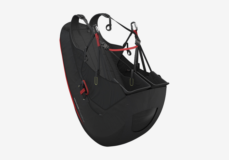 人間工学的に計算された形状のシートエリアはパイロットの体にパーフェクトにフィットします。 プレッシャーポイントが除かれ、座り心地が良くなりました。 さらに、地上での動きやすさは劇的に改善されました。 走っているときに膝をたたくシートボードがないのです。 シートボードがないことは、約3.5kgという軽さの大きな理由の一つになります。リュックサック込みでこの軽さです!